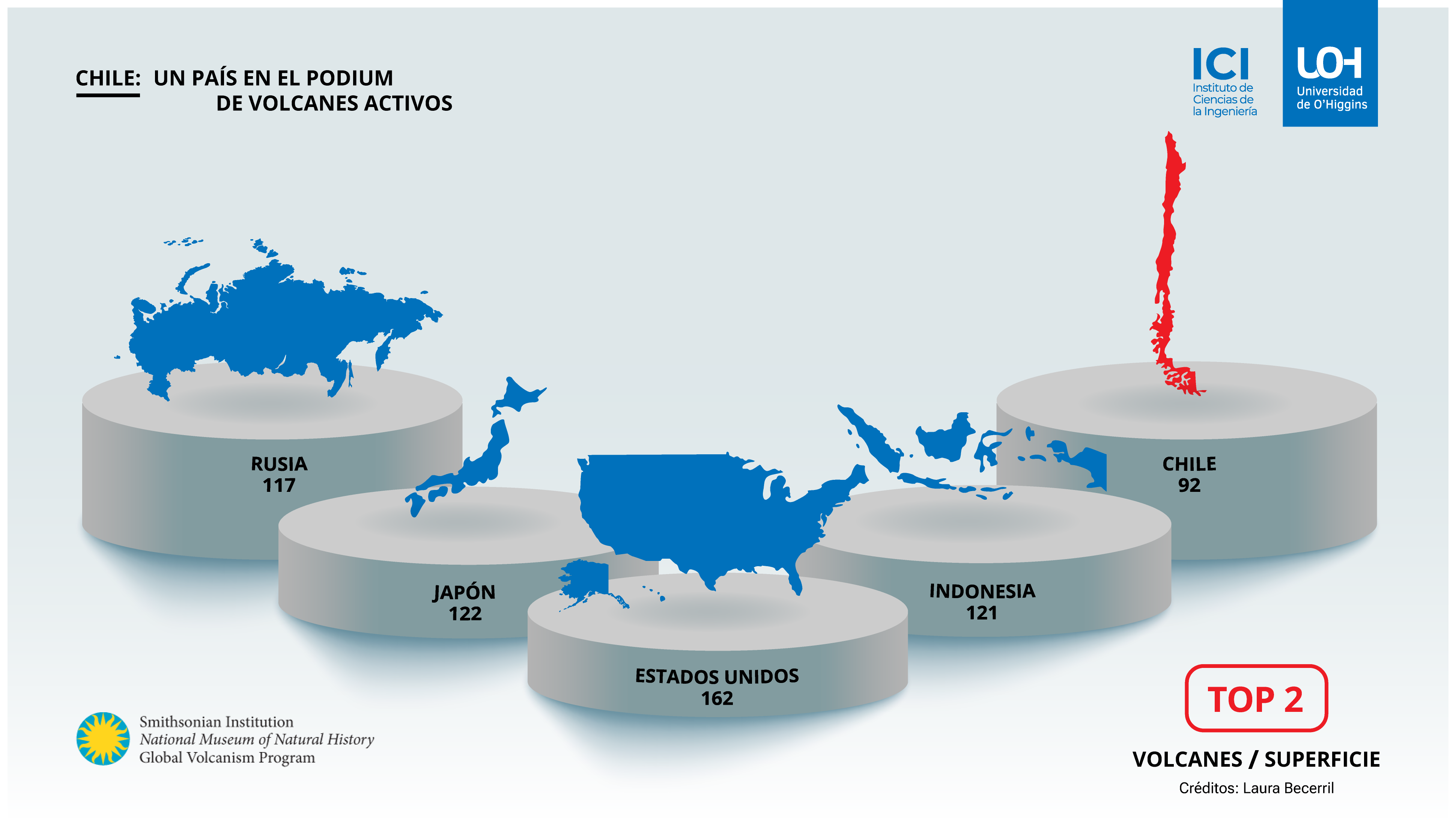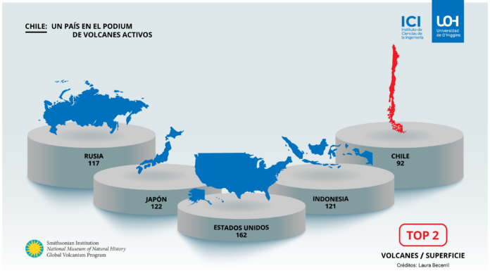 La académica del Instituto de Ciencias de la Ingeniería (ICI) de la Universidad de O’Higgins (UOH), Laura Becerril, explica que la clasificación se elabora considerando superficie y número de volcanes que tiene un país.