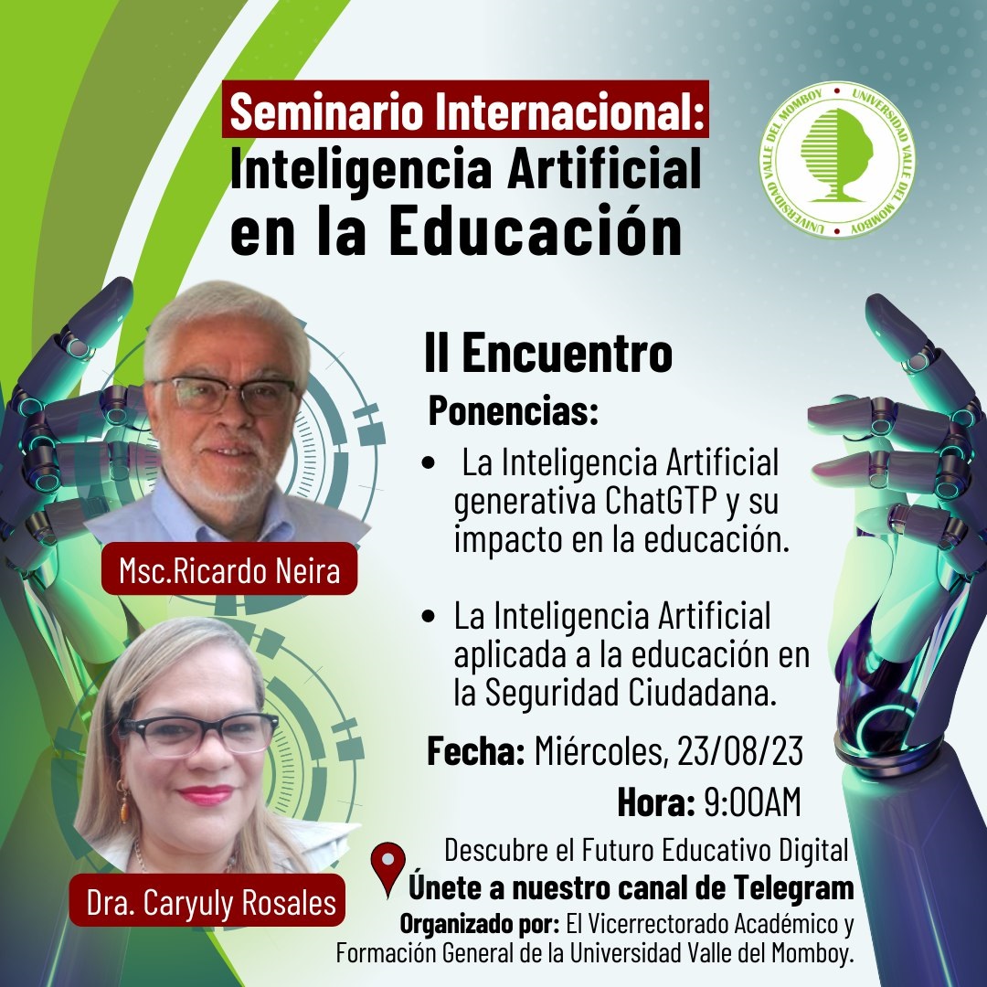 Este miércoles 23 de agosto a las 9:00 horas se realizará el II Seminario sobre Inteligencia Artificial de la Universidad de la Universidad Valle del Momboy Venezuela, donde se abordará el rol de la inteligencia artificial generativa en el chat gpt y la inteligencia artificial aplicada en la educación de la seguridad ciudadana.