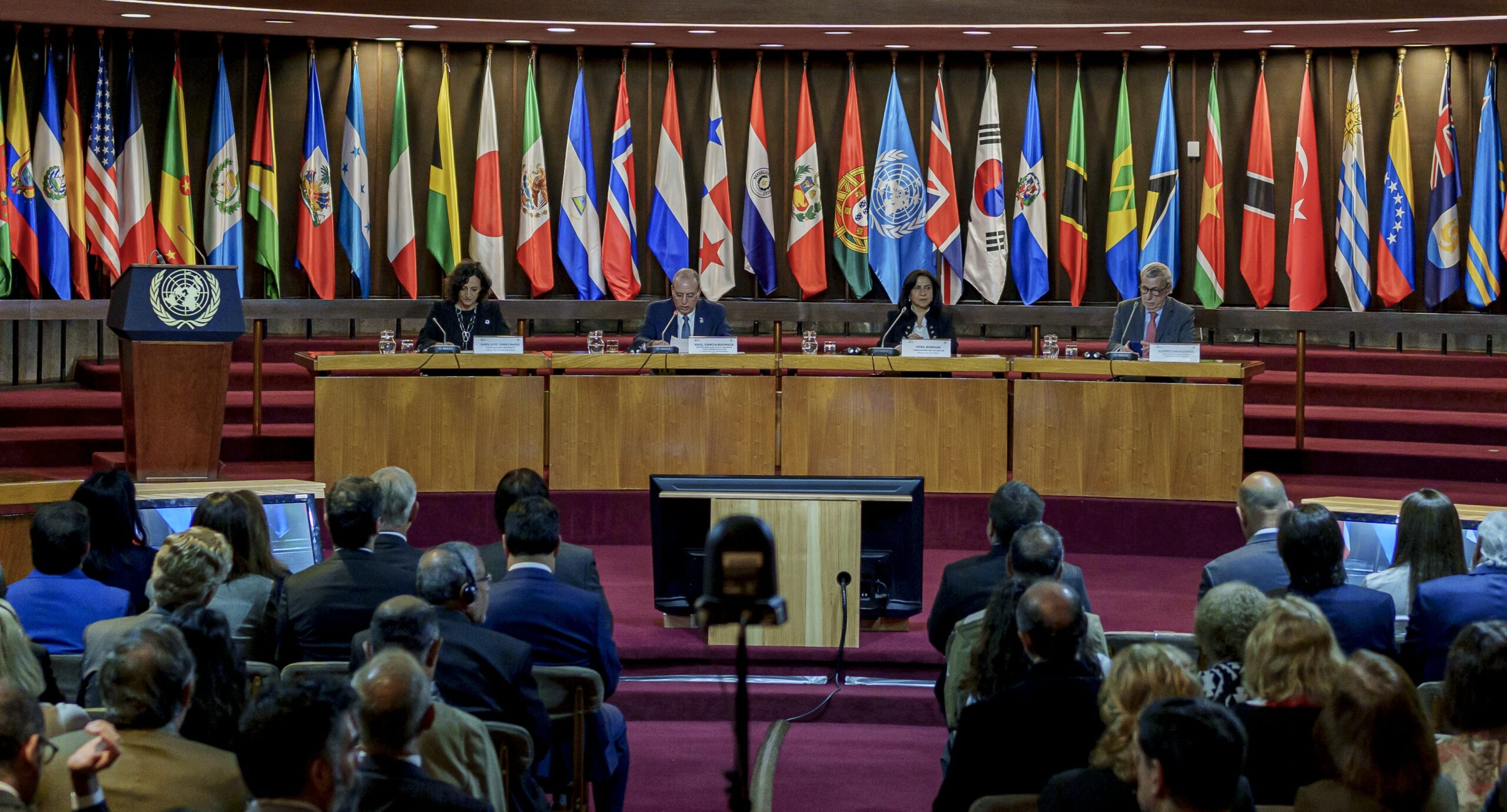 De izquierda a derecha: la Coordinadora Residente de las Naciones Unidas en Chile, María Torres; el Secretario Ejecutivo Adjunto para Administración y Análisis de Programas CEPAL, Raúl García-Buchaca,; la Embajadora del Estado de Palestina en Chile, Vera Baboun y el Ministro de Relaciones Exteriores, Alberto van Klaveren.
