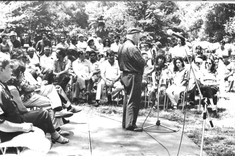 Fotografía Central: Volodia Teitelboim en uno de los foros de la Fiesta de Los Abrazos para el año 1990