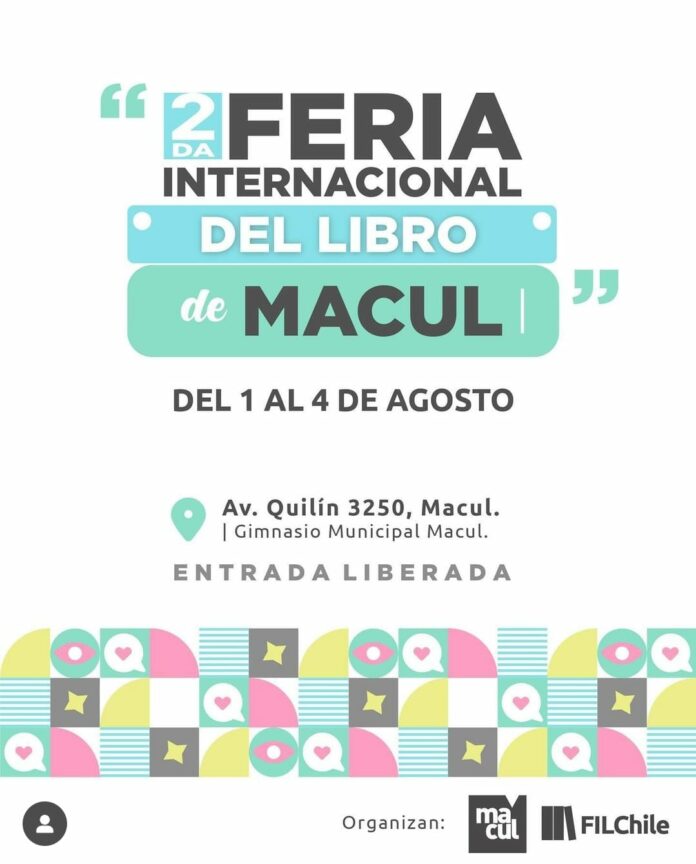 Comenzamos con la 2da Versión de la Feria Internacional del Libro de Macul donde encontrarás conversatorios, foros, presentaciones artísticas, musicales y más de 90 actividades. Hasta este domingo 04 de agosto en el Gimnasio Municipal de dicha comuna. Toda la información, detalles y descarga de entradas gratuitas en www.filchile.cl y en las redes @filchile @filmacul.cl