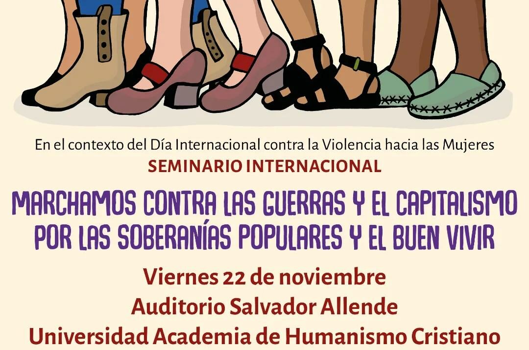 Este viernes 22 de noviembre se llevará a cabo un seminario que reunirá a más de una decena de expositoras en el salón Salvador Allende de la Academia de Humanismo Cristiano. Tras una actividad de mística, se dará inicio a los dos conversatorios abiertos llamados “Contra el sistema neoliberal: propuestas feministas del internacionalismo de la marcha mundial de mujeres” y “Economía feminista y cuidados: comunidades organizadas para la vida”. En ellos participarán dirigentas de los países de Bolivia, Estados Unidos, Honduras, Cuba, México, Brasil, Perú, Canadá y Chile.