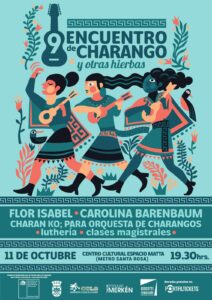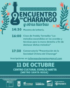 La novena edición del Encuentro de Charango y Otras Hierbas tendrá lugar durante la tarde del sábado 11 de octubre en el reconocido Espacio Matta de La Granja. Con una programación de actividades desde las 14:30 horas, Taller Popular Merkén invita al encuentro que contempla una muestra de lutheria, clases, conversatorios y presentaciones musicales destacadas. Carolina Barenbaum, quien será acompañada por Andrea Gauna, ambas charanguistas argentinas; y Flor Isabel, que será acompañada por Rosario Peredo, que vendrán desde Bolivia para asistir al encuentro.