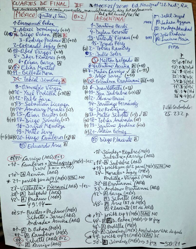 Los dos goles cayeron en los dos minutos 08: en el Primer Tiempo, Maher Carrizo; y en el Segundo Tiempo, Mateo Silvetti; ambos en contracargas veloces y directas: rematando frontal en centro bajo de la izquierda por Gianluca Prestianni, y en arranque de mediacancha frontalmente y definición con diestrazo cruzado a la derecha, respectivamente. Los lesionados que abandonaron fueron el lateral derecho, Alexei Domínguez, en los 07, pero recién pudiendo ser sustituido después de la apertura del marcador (ingresó en su mismo puesto Hugo Camberos, quien, más adelante, pasó de volante por derecha y de delantero por ese lado y por izquierda); mientras que en Argentina, una molestia del stopper derecho, Valente Pierani, reemplazado por Juan Villalba, que entró de stopper por izquierda, pasando al lugar del lesionado el otro central de marca, Tobías Ramírez.