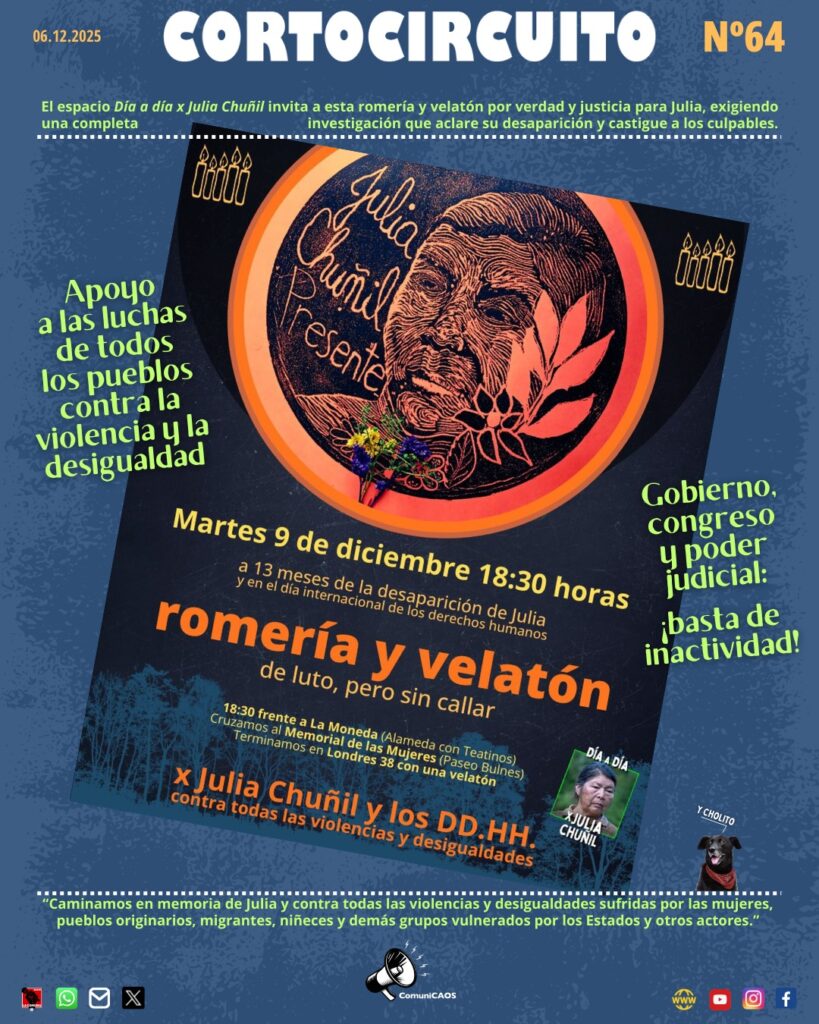 Hoy Martes 9 de diciembre se realizará a las 18:30 horas una romería y velatón por Julia ChuñilA trece meses de su desaparición forzada, denunciamos la inacción del gobierno, el parlamento y el poder judicial, y exigimos una investigación completa por verdad y justicia para Julia Chuñil.